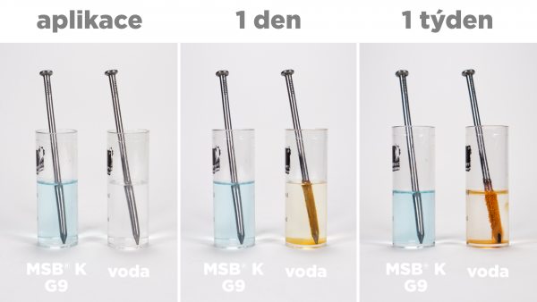 Na přiloženém obrázku je demonstrováno, jak MSB® K G9 chrání kovové povrchy před korozí ve srovnání s vodou. I po týdnu aplikace v kapalině MSB® K G9 zůstává povrch bez známek koroze, zatímco povrch ve vodě vykazuje výraznou korozi.